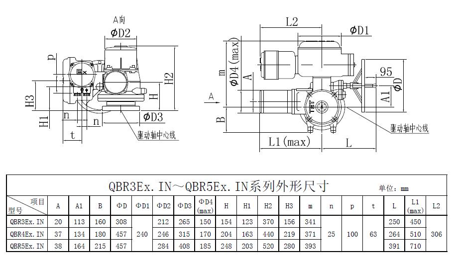 QBR3QBR5是我公司研制的部分回轉(zhuǎn)閥門電動(dòng)裝置,控制轉(zhuǎn)矩范圍:900N.m12000N.m。該電動(dòng)裝置可與球閥﹑蝶閥等閥瓣做90°回轉(zhuǎn)的閥門組合成電動(dòng)閥門,其功能是控制閥門的啟閉。該電動(dòng)裝置能夠進(jìn)行單機(jī)或多機(jī)室內(nèi)控制遠(yuǎn)距離控制電動(dòng)操作和現(xiàn)場(chǎng)手動(dòng)或電動(dòng)操作,可廣泛地應(yīng)用在具有管道閥門的工業(yè)系統(tǒng)。該產(chǎn)品的防護(hù)等級(jí)為IP67,隔爆型產(chǎn)品(型號(hào)中有Ex)的隔爆等級(jí) 為dBT4