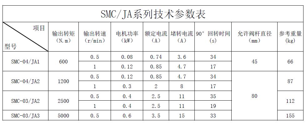 SMC/JA系列閥門電動裝置是部分回轉型閥門電動裝置,適用于球閥、蝶閥等類型閥門以及電動風門。其結構形式為組合式,由SMC多回轉電動裝置與JA部分回轉減速裝置相組合而成。該系列產品所適用的環(huán)境條件、溫度、濕度、海拔、防護等級均能達到SMC相應規(guī)格產品的水平。